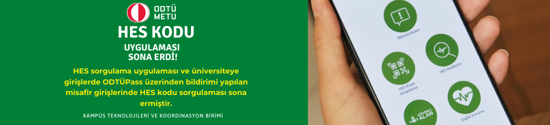 20.09.2021 tarihinde yayınladığımız COVID-19 Yönetim ve İzleme Planı (YİP) süreçleri kapsamında uygulamaya konulan HES Kodlarının toplanması, METU Portal üzerinden günlük HES sorgulama uygulaması ve üniversiteye girişlerde ODTÜPass üzerinden bildirimi yapılan misafir girişlerinde HES Kodu sorgulaması sona ermiştir.